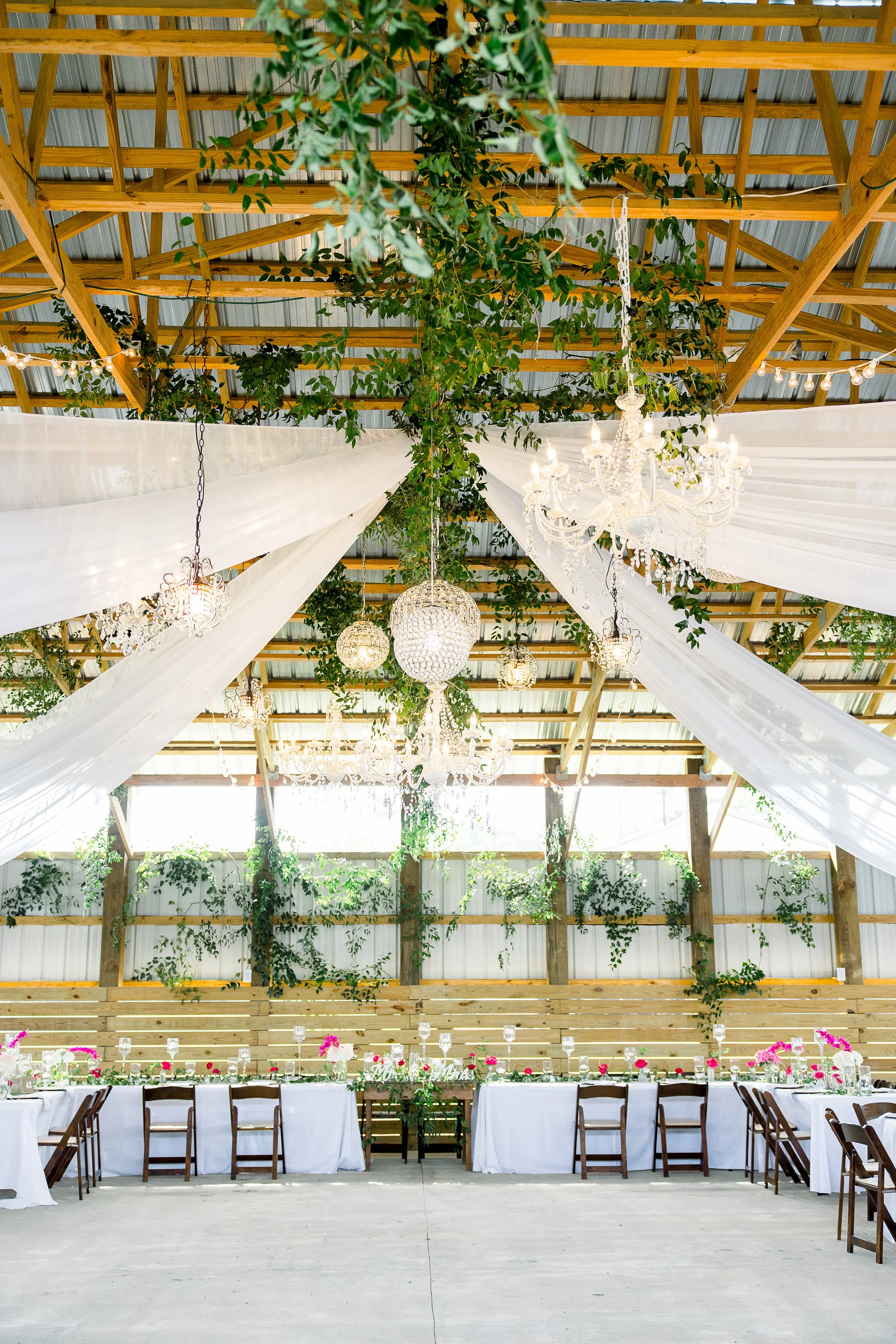 The couple chose to celebrate their love with a reception that took place on a family farm. The barn look and open space with the added elements of chandeliers and greenery created a rustic elegant look that had everyone in awe. The large guest count was accommodated comfortably as the barn provided ample space for everyone to celebrate and dance the night away.